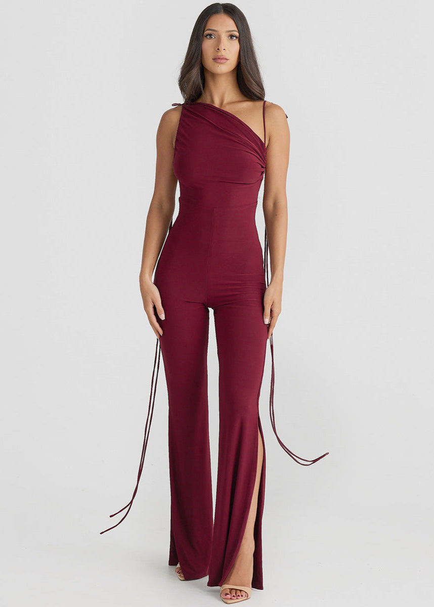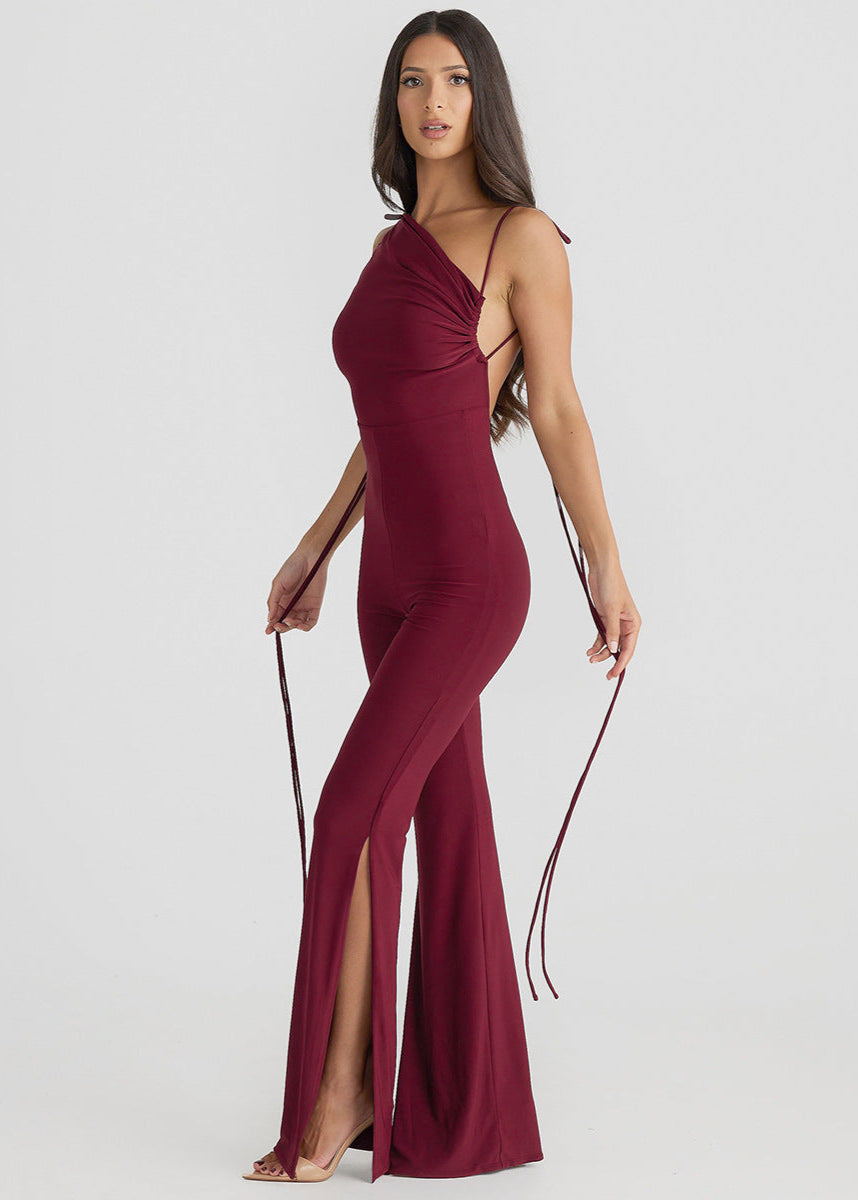 Transformez chaque apparition en moment inoubliable avec cette combinaison dos nu ultra féminine. Grâce à ses longues lanières modulables, vous pouvez ajuster le haut en plusieurs styles (asymétrique, col drapé, bustier ou noué autour du cou). Son tissu fluide épouse parfaitement les courbes, tandis que les fentes en bas des jambes ajoutent une touche sensuelle.