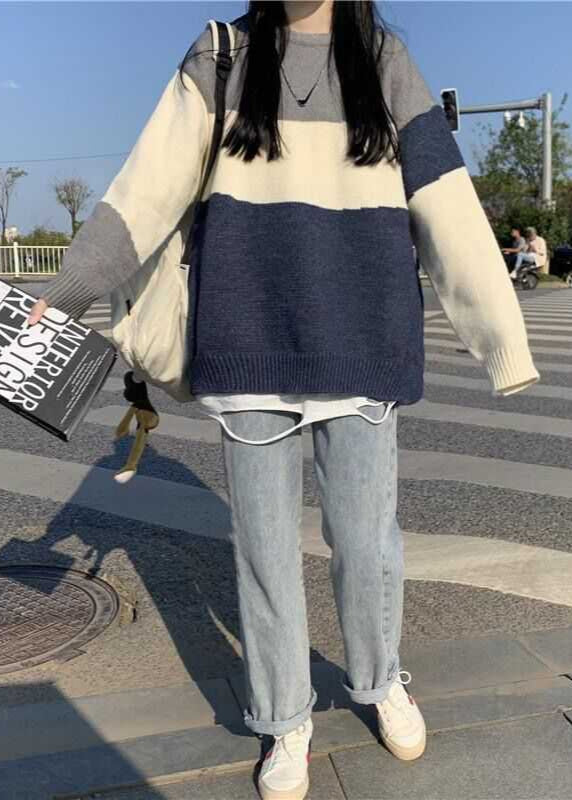 - Détails : Design color-block à trois tons (gris, crème et bleu marine), col rond, manches longues tombantes