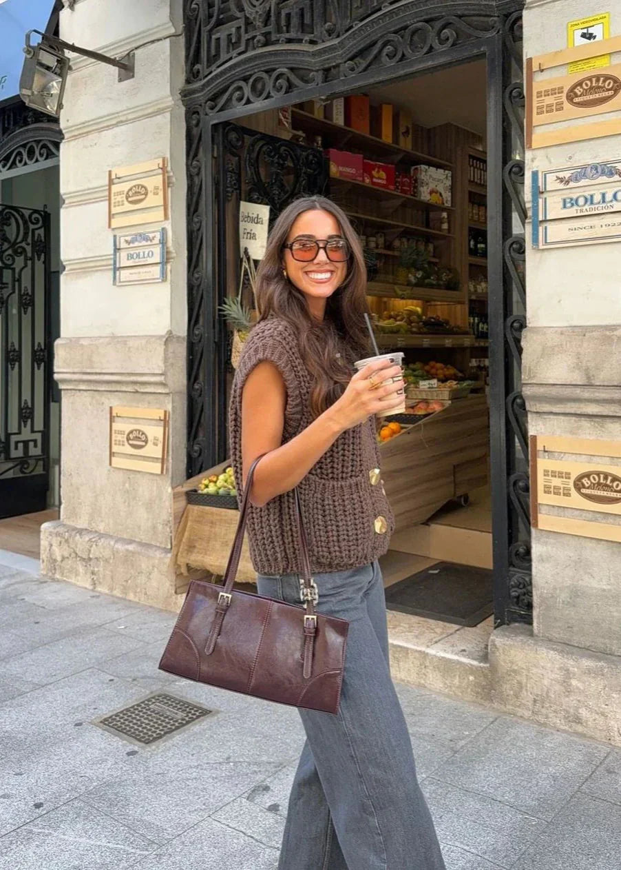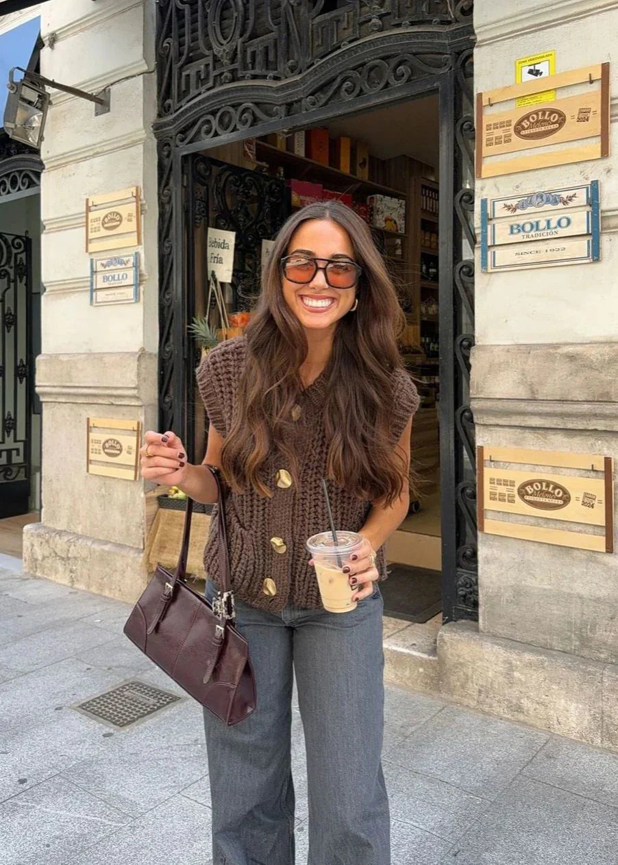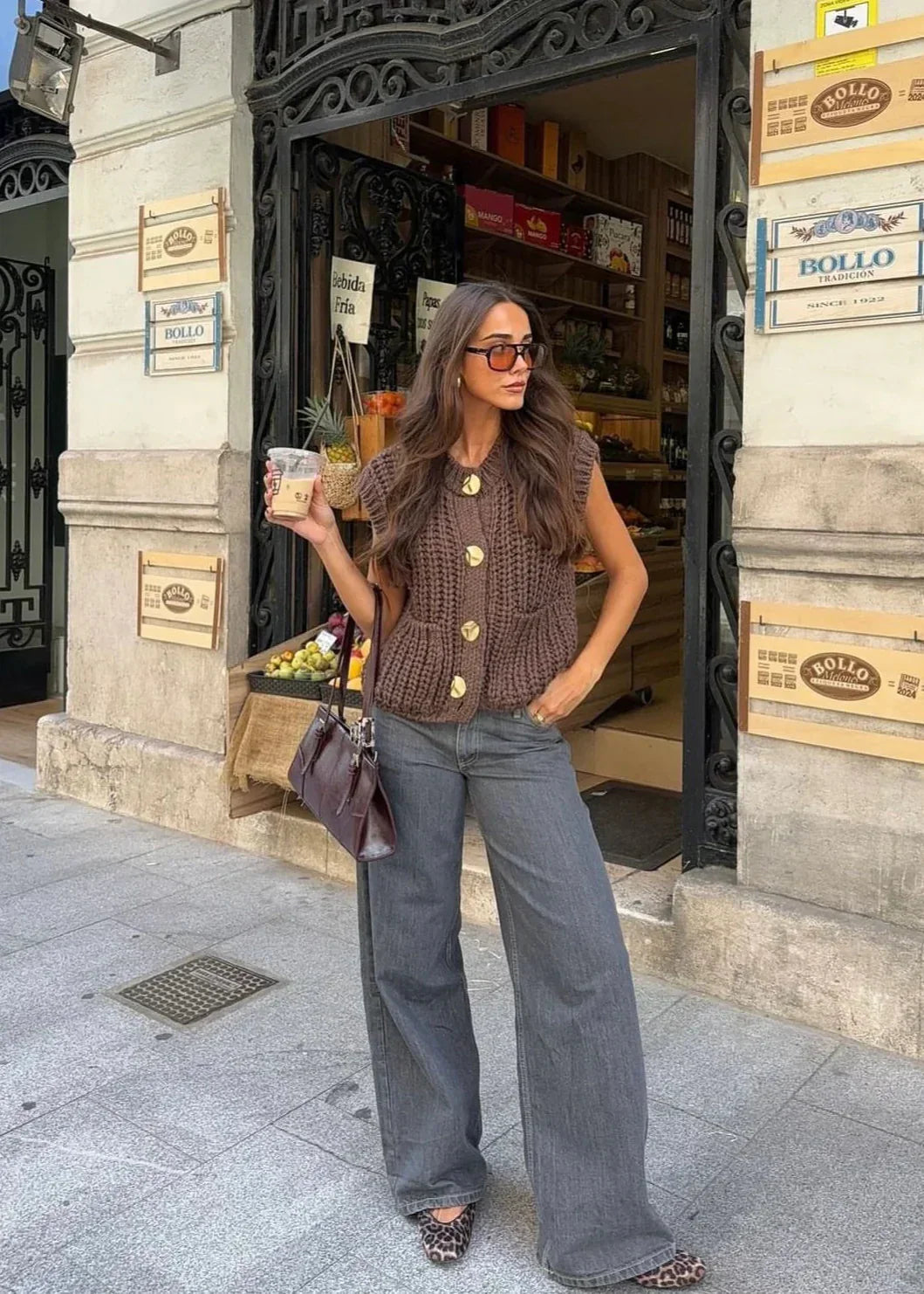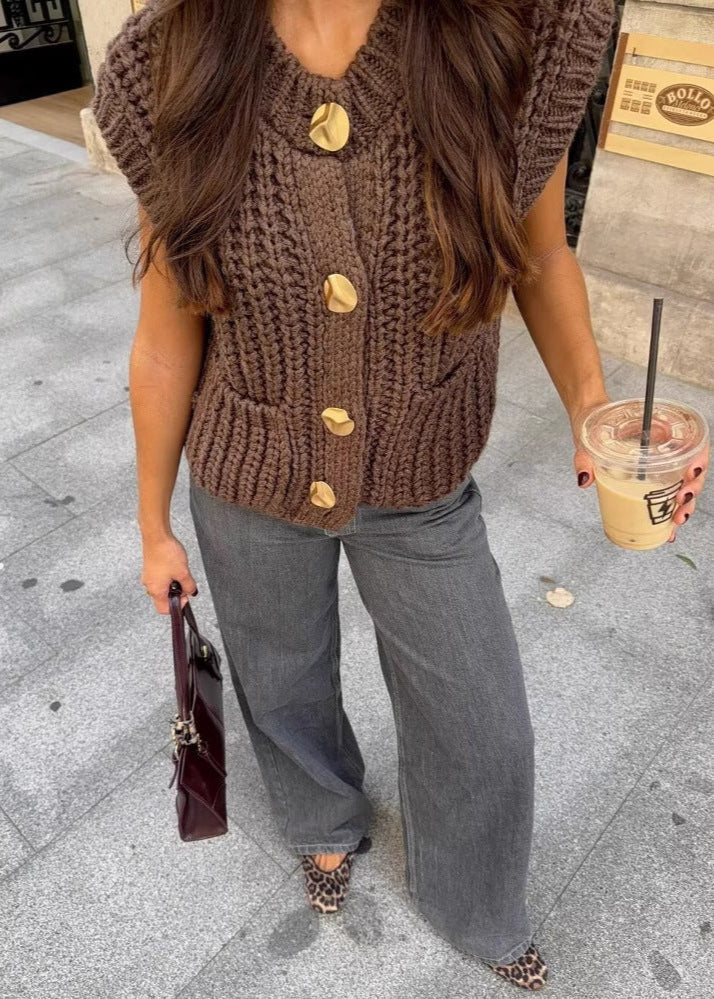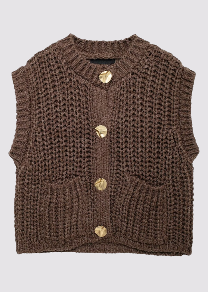 Apportez une touche chic et cosy à vos looks avec ce gilet sans manches en maille épaisse. Sa coupe moderne et décontractée et ses boutons dorés élégants en font une pièce tendance qui attire le regard.